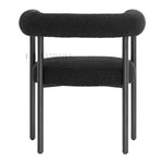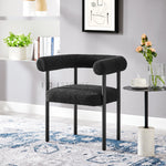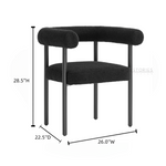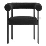 The  Chair features sleek black iron legs with non-slip pads for stability and floor protection.