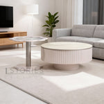 This stylish round coffee table combines a luxurious rock slab top with an elegant fluted base design. The robust surface offers exceptional resistance to heat, scratches, and stains, making it both beautiful and highly practical for daily use. With its soft curves and refined details, it serves as a modern, elegant centerpiece that elevates any living space.