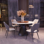This elegantly designed circular dining table stands 30 inches high with a 53-inch diameter, offering generous seating for six—making it ideal for family dinners or friendly gatherings. It features a circular artificial walnut wood turntable that adds sophistication and function, while the tabletop is crafted from white high-hardness slate for a sleek appearance and outstanding durability. The black sprayed conical legs provide reliable support while enhancing its modern aesthetic, ensuring a stable and lasting centerpiece for your dining space. Best of all, it requires minimal effort to install and fits seamlessly into any environment.