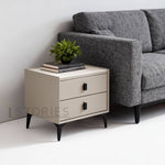 This contemporary nightstand features clean lines and a refined neutral tone, designed with two spacious drawers for bedside essentials and a sleek faux marble top for a touch of elegance. Supported by sturdy tapered legs, it combines stability with modern appeal, making it a perfect addition to contemporary or minimalist bedrooms.