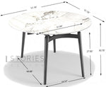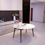Presenting a remarkable round dining table designed to become the centerpiece of your dining area. Supported by four sturdy black metal legs, it offers both a stable foundation and a contemporary, sleek aesthetic. The tabletop is crafted from beautifully finished sintered stone in an elegant coffee base tone, where delicate coffee-white veins dance across the surface—smooth, rich in variation, and undeniably luxurious.