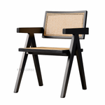 - Crafted with woven rattan on a sturdy black wood frame, this chair blends natural texture with modern structure. Its unique design adds organic elegance to any dining space.
